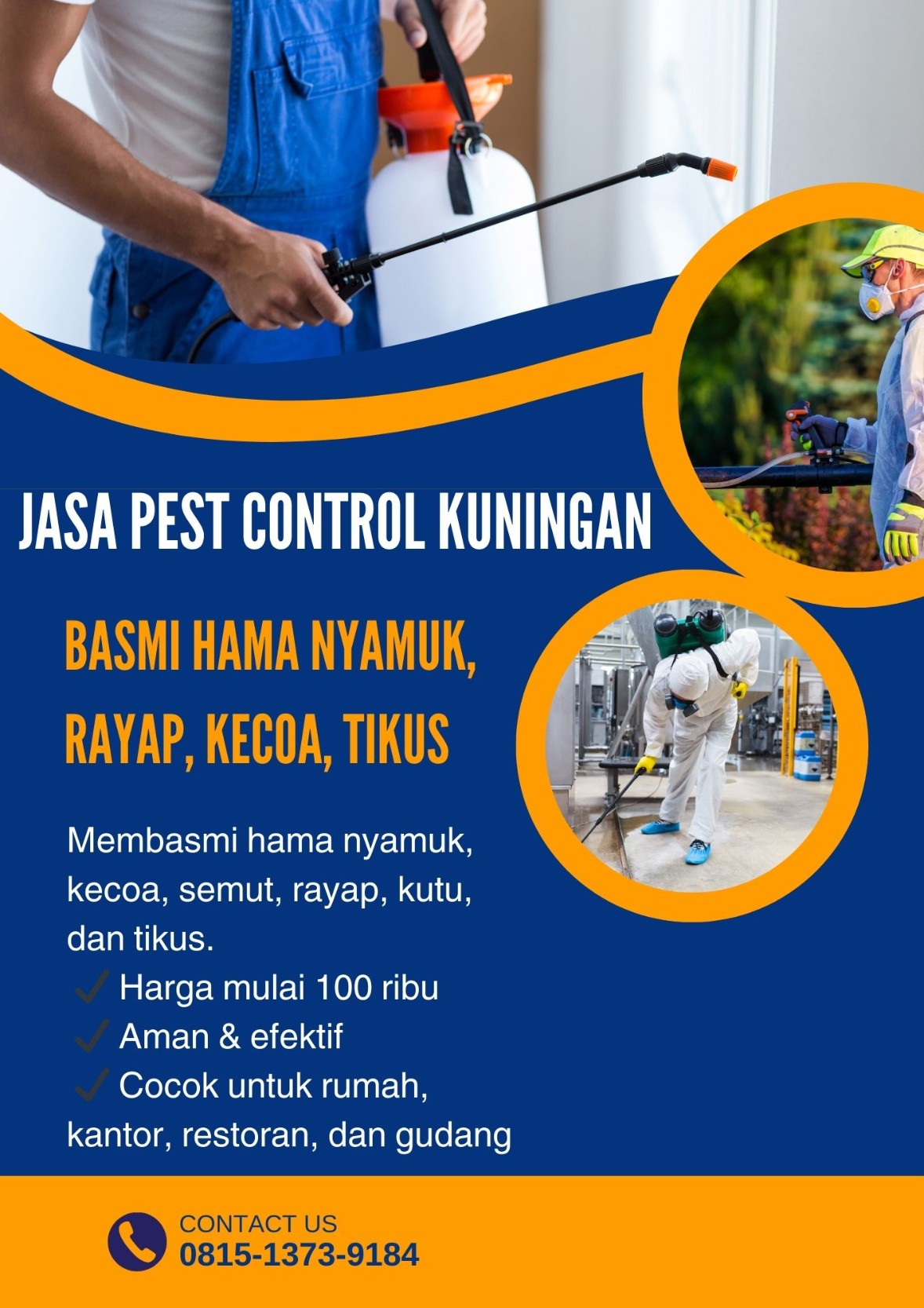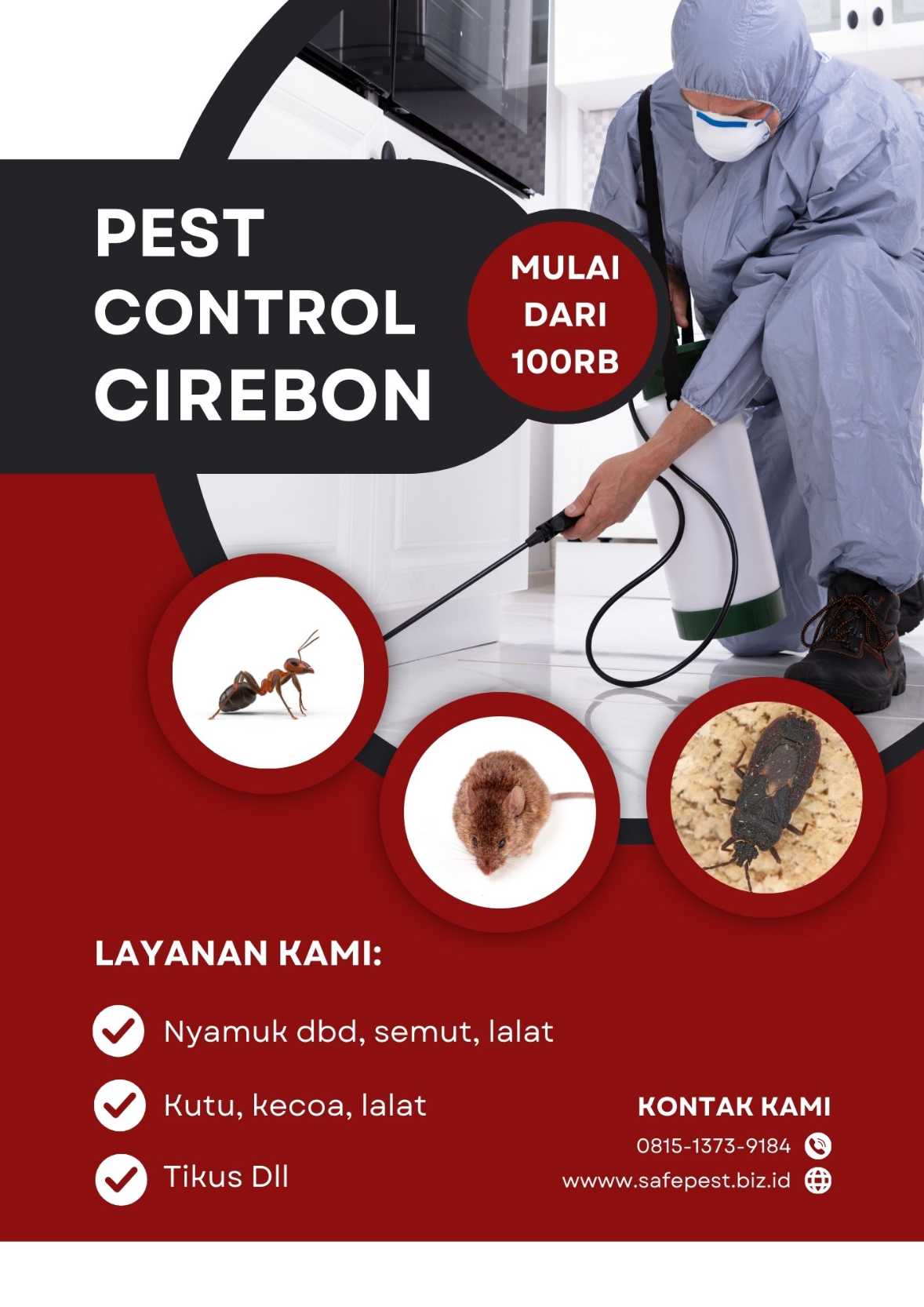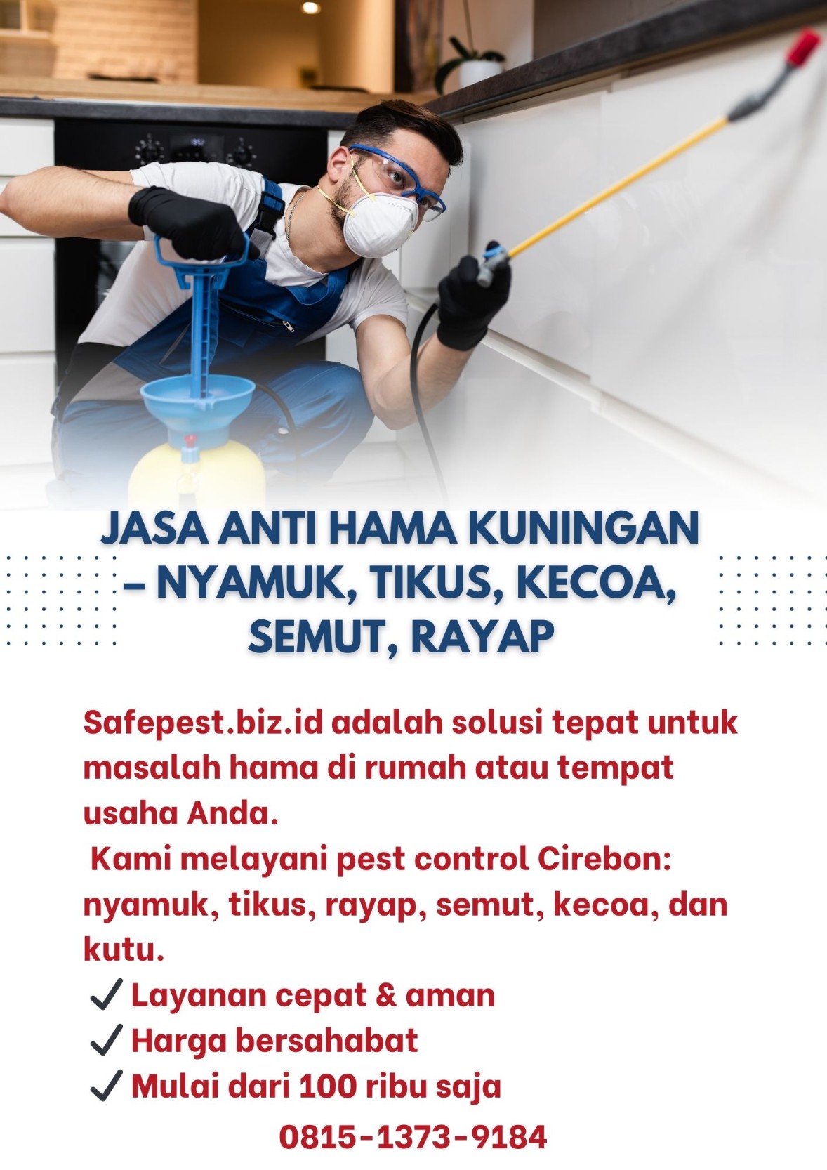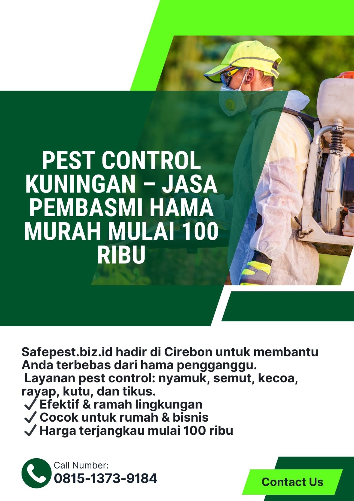 0815-1373-9184 – Hubungi Kami Sekarang! SafePest Kuningan – Jasa Pest Control Profesional & Penyemprotan Fogging Hama SafePest hadir di Kuningan, Jawa Barat, untuk memberikan solusi pengendalian hama lengkap. Kami melayani penyemprotan dan fogging nyamuk, lalat, kecoa, semut, kutu, rayap, tikus, serta hama pengganggu lainnya. Dengan tim teknisi berpengalaman, peralatan modern, dan bahan aman lingkungan, kami memastikan rumah, kantor, restoran, sekolah, kos-kosan, dan usaha Anda terbebas dari gangguan hama. Kami siap melayani panggilan ke seluruh kecamatan di Kuningan, termasuk: Kuningan Cigugur Kadugede Cilimus Luragung Ciawigebang Garawangi Darma Jalaksana Maleber Pancalang Subang Cibingbin Lebakwangi dan seluruh wilayah Kuningan lainnya. Keunggulan SafePest Kuningan: Layanan fogging nyamuk & penyemprotan hama lengkap Teknisi profesional, berpengalaman, dan sigap Bahan pengendalian hama aman & ramah lingkungan Harga kompetitif mulai dari Rp150.000 Hubungi kami sekarang di WhatsApp 0815-1373-9184 untuk konsultasi gratis & jadwal penyemprotan. SafePest Kuningan adalah mitra terpercaya Anda dalam layanan pest control profesional.