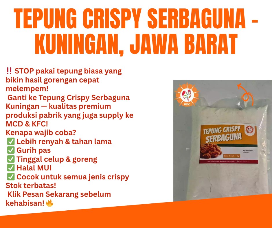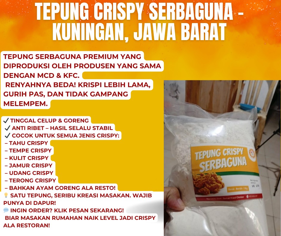 Hubungi WhatsApp 0822-6283-3016. Tepung Crispy Serbaguna Kuningan adalah usaha produksi tepung bumbu premium yang berlokasi di Kabupaten Kuningan, Jawa Barat. Produk kami dirancang untuk memenuhi kebutuhan rumah tangga dan pelaku kuliner yang ingin menyajikan gorengan renyah, gurih, dan tahan lama dengan cara praktis dan hasil yang konsisten. Kami melayani seluruh wilayah Kuningan, termasuk *Kuningan, Cigugur, Cilimus, Jalaksana, Japara, Garawangi, Kramatmulya, Sindangagung, Cigandamekar, Ciawigebang, Maleber, Cidahu, Ciwaru, Cibingbin, Luragung, Cimahi, Cibeureum, Nusaherang, Ciniru, Kalimanggis, Darma, Kadugede, Cipicung, Pasawahan, Pancalang, Mandirancan, Lebakwangi, Hantara, Selajambe, Cilebak, Karangkancana, dan Cigandamekar. Dengan jangkauan distribusi yang luas, kami memastikan pelanggan di seluruh kecamatan dapat memperoleh tepung crispy berkualitas tinggi dengan mudah. Produk kami diproses secara higienis, menggunakan standar mutu yang terjaga, serta telah memiliki Sertifikat Halal MUI. Tepung ini cocok digunakan oleh keluarga, pedagang gorengan, warung makan, hingga usaha kuliner skala besar yang ingin menghadirkan makanan crispy yang renyah lebih lama dan memiliki rasa gurih seimbang. Kami menyediakan layanan pembelian eceran dan grosir, serta pengiriman ke berbagai wilayah untuk mendukung kebutuhan dapur dan usaha Anda. Dengan Tepung Crispy Serbaguna Kuningan, siapa pun bisa menghasilkan crispy berkualitas restoran dalam waktu singkat.