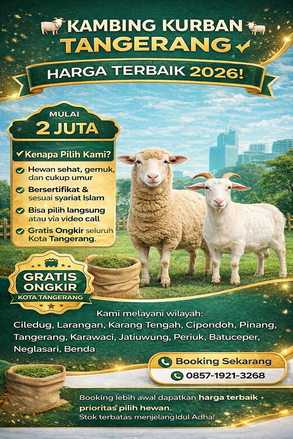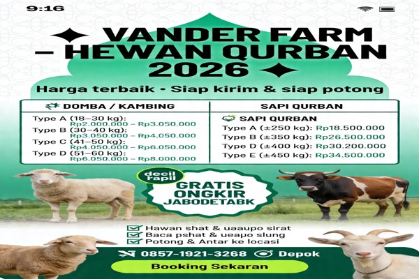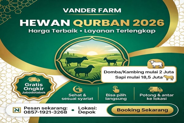 hub: 0857-1921-3268 “Kambing Kurban Tangerang Layanan Potong, Bersih, dan Antar Sampai Lokasi” adalah usaha penyedia kambing kurban profesional yang melayani seluruh wilayah Tangerang raya dengan standar kualitas tinggi, amanah, serta sesuai syariat. Kami hadir untuk mempermudah masyarakat dalam mendapatkan kambing kurban sehat tanpa harus repot mencari sendiri, mengurus pemotongan, hingga distribusi daging. Semua kebutuhan ibadah kurban Anda kami siapkan dalam satu layanan lengkap dan terpercaya. Kambing kurban yang kami sediakan berasal dari peternakan aman, sehat, dan melalui pemeriksaan rutin oleh tenaga ahli. Setiap hewan memenuhi syarat syariat: cukup umur, sehat, tidak cacat, serta siap disembelih pada waktu pelaksanaan kurban. Kami memberikan opsi bagi pelanggan untuk memilih langsung di lokasi atau melalui katalog foto dan video. Keunggulan utama kami adalah layanan potong, bersih, dan antar sampai lokasi. Proses penyembelihan dilakukan oleh juru sembelih yang memahami tata cara kurban sesuai ketentuan Islam. Setelah dipotong, daging langsung dibersihkan, dipisahkan, ditimbang, dan dikemas dengan rapi sehingga siap untuk dibagikan kepada mustahik. Semua dilakukan dengan higienis dan transparan. Layanan kami mencakup seluruh wilayah Tangerang, meliputi Kota Tangerang, Kabupaten Tangerang, dan Kota Tangerang Selatan, sehingga masyarakat di tiga wilayah tersebut dapat menikmati layanan kurban lengkap tanpa hambatan. Wilayah Pelayanan – Kecamatan Kota Tangerang Kami melayani seluruh kecamatan di Kota Tangerang, yaitu: Ciledug, Larangan, Karang Tengah, Cipondoh, Pinang, Tangerang, Karawaci, Jatiuwung, Periuk, Batuceper, Neglasari, Benda. Wilayah Pelayanan – Kecamatan Kabupaten Tangerang Kami juga melayani pemesanan dan pengantaran ke seluruh kecamatan di Kabupaten Tangerang, meliputi: Balaraja, Jayanti, Cisoka, Tigaraksa, Jambe, Cikupa, Panongan, Curug, Kelapa Dua, Legok, Pagedangan, Cisauk, Pasar Kemis, Sindang Jaya, Rajeg, Sepatan, Sepatan Timur, Kosambi, Teluknaga, Pakuhaji, Kronjo, Mekar Baru, Gunung Kaler, Kresek, Sukamulya, Mauk. Wilayah Pelayanan – Kecamatan Tangerang Selatan Untuk Tangerang Selatan, kami melayani seluruh kecamatan yang mencakup: Serpong, Serpong Utara, Pondok Aren, Ciputat, Ciputat Timur, Pamulang, Setu.